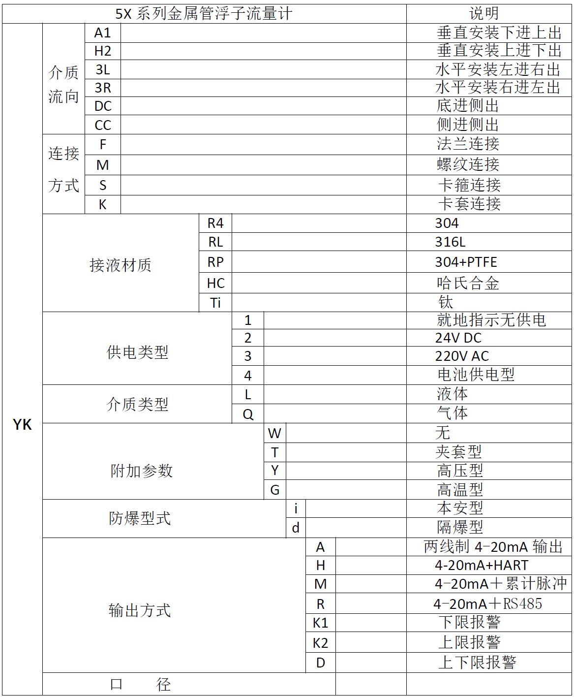 ★根据测量管结构的不同,YK5系列金属管浮子流量计分为YK50、YK51、YK52、YK53型,可根据用户不同要求选择不同的测量管形式,在维护与清洁方面有进一步的完善。